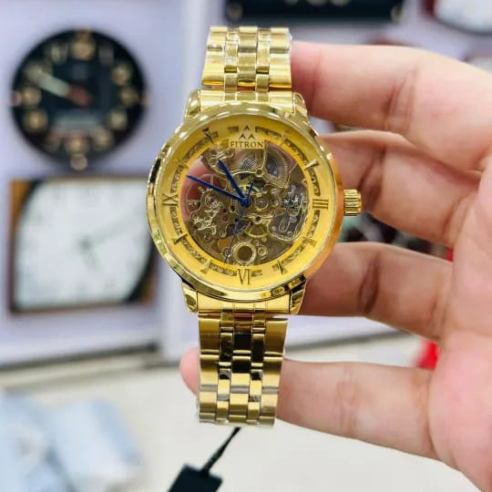 Dial: Roman numerals aur blue hands ke saath elegant design.