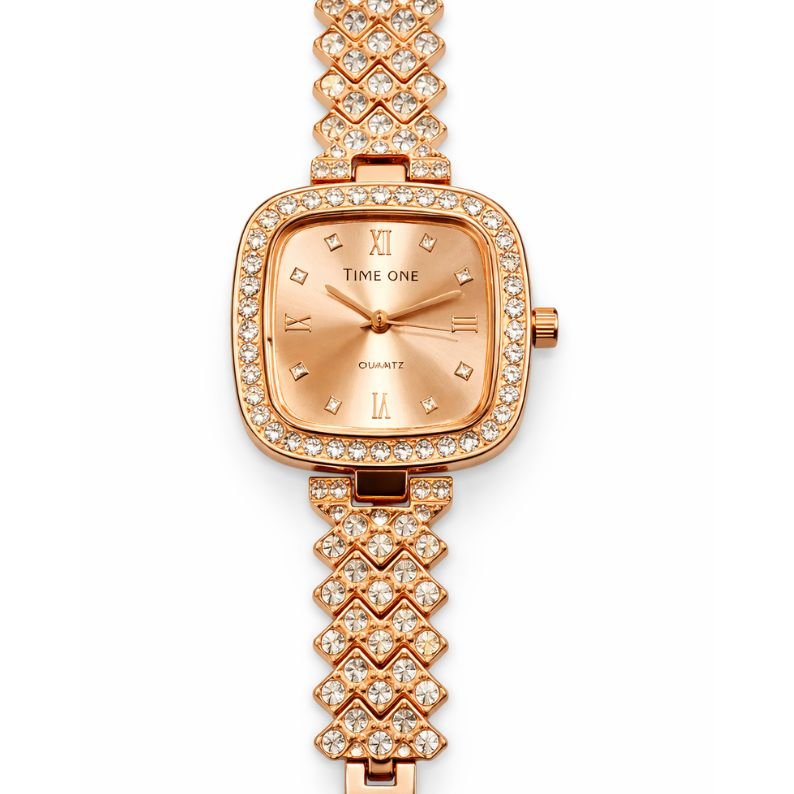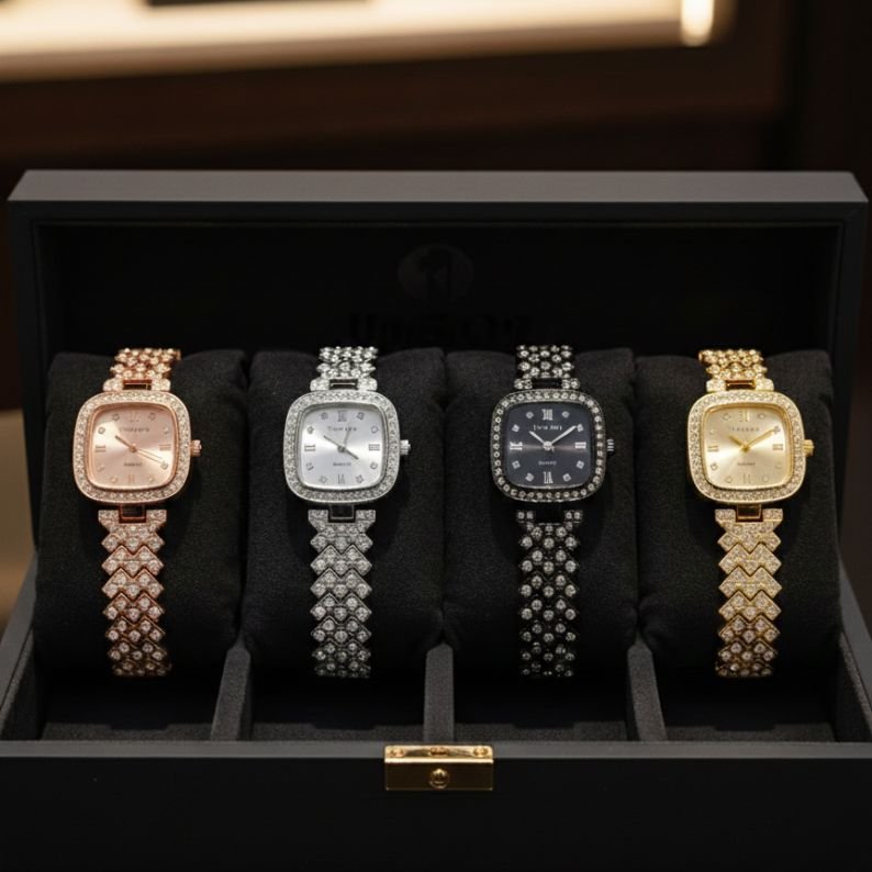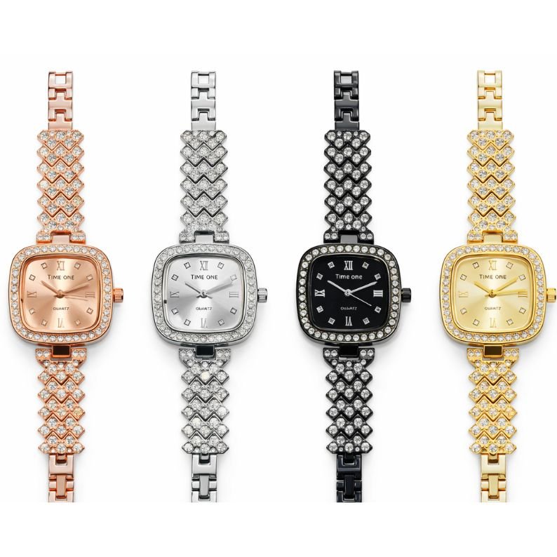 • Design: Premium Square Crystal Case decorated with high-shine stones.
